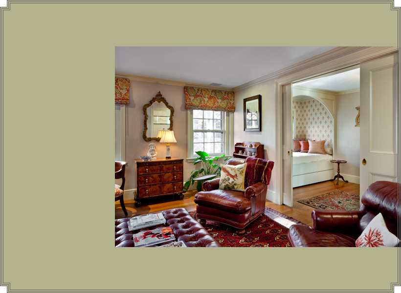 A small bedroom adjacent to the office maintains its privacy through the incorporation of custom double pocket doors.