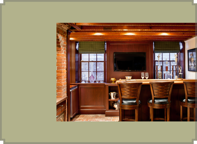 Newly exposed antique ceiling timbers are accented with a soft, warm glow provided by recessed lighting. The custom mahogany wall panels and millwork behind the bar offer space for display, storage and a flat-screen tv.