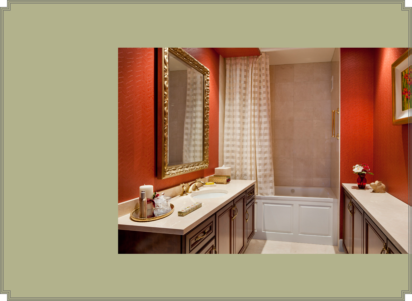 A rich, warm guest bathroom was achieved with cherry cabinetry and crème marble counters accented with a deep crimson wallpaper.